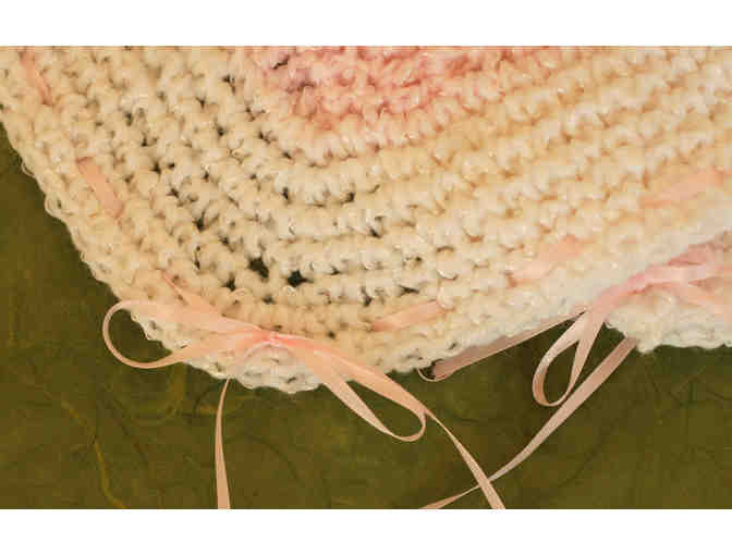 A Small Pink & White Handknit Baby Blanket with Pink Ribbon Border by Families Together Parent Laney Wilson.