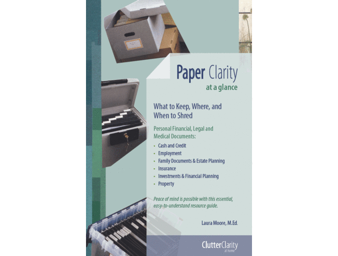 Pick your project, and let's get to work together! Get 4 times more done, and enjoy doing it with Laura Moore, M.Ed. De-Cluttering, Organizing or Re-Design. Includes copy of essential Resource Guide: Paper Clarity: What To Keep, Where, and When to Shred.