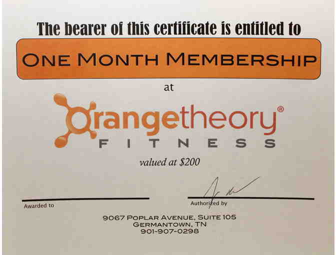 The bearer of this certificate is entitled to a one month membership at Orangetheory Fitness. Increase energy, get visible results and burn more calories. That's the Orange Effect! No expiration date noted