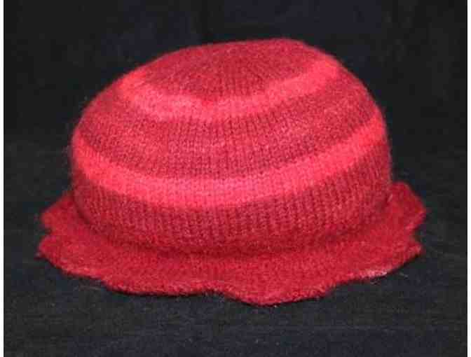 Think you can't wear hats? Think again. This charming, red striped, cloche hat, hand knit by a Seeing Eye graduate, is in a style that looks cute on anyone. In merlot wool with true-red stripes and a scalloped bottom, it would nicely accent a grey, camel, navy, red, white or black coat.