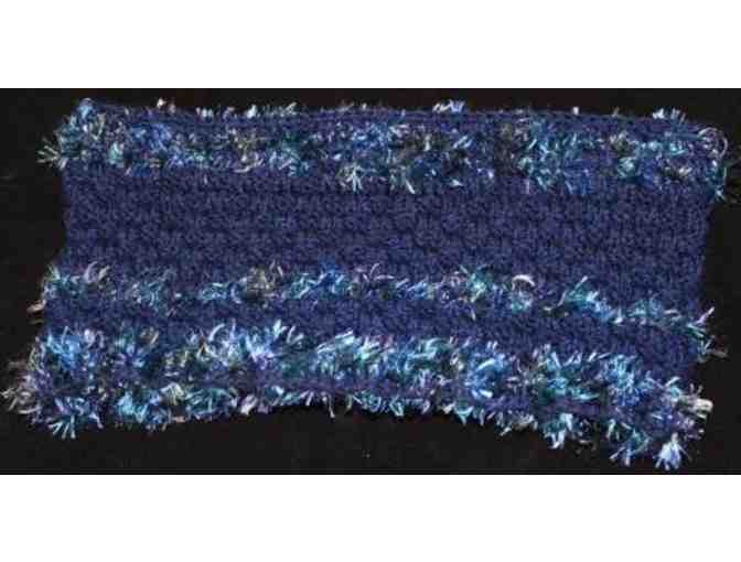 Warm and wooly, this is a hand knit cowl in navy blue and is about 26 inches around and features navy blue and hunter green “fun-fur” stripes around the edges of the eight inch neckpiece. The cowl is knit in an intricate basketweave stitch except where the “fur” pieces are knit into stripes near the edges. Both sides of this cowl are as soft as fur without harming any animals.