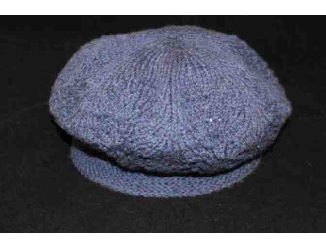 This fashionable hat is hand-stitched by a Seeing Eye graduate. In a heathery navy/purple tone, it has a lacy “feather and fan”-type stitch with a wide band border and a tam-type top. Sized for a woman, it will draw attention for its understated beauty while keeping your head and ears toasty next winter.