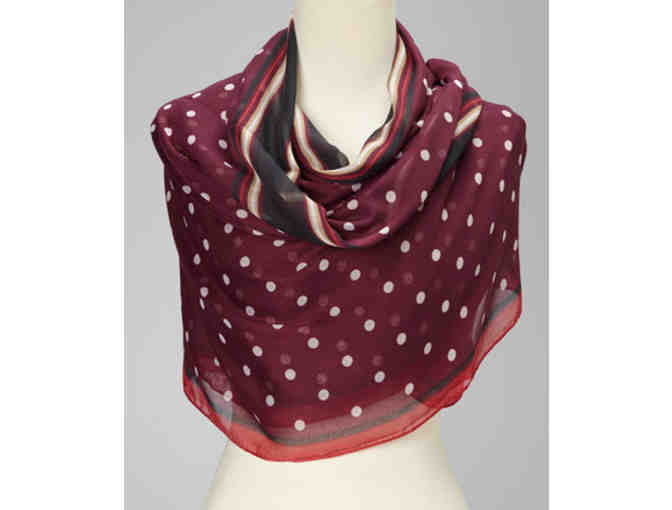 An item any woman will treasure. Not too light, not too heavy, this lovely eggplant scarf in 55% silk, 45% linen, drapes elegantly and kicks any outfit up a notch. Dotted with white polka-dots, the aubergine color is very versatile and goes with almost everything. The 39”x 70” size allows for multiple styles.