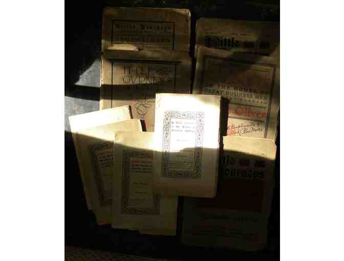 Collection of nine of Elbert Hubbard's "Little Journeys". Collection consistes of five paperback Roycrofter editions: Theodore Parker (1907), James Oliver (1909), Erasmus (1908), Thorwadsen (1902) and Richard Cobden (1907). These are done in the customary fashion of the Roycrofters, with decorative elements, some pictures and quality paper. Copies originally sold for ten cents, so that anyone could afford them and thus learn about the people Elbert Hubbard believed it was important to know about. These editions are in good shape overall. there is some foxing and an occasional tatter. Covers on Thorwaldsen and Erasmus are detached. Everything is readable. Wonderful ads for Roycrofter products that would sell for a mint today. This collection also includes four of Hubbard's Little Journeys that were printed by G.P. Putnam's Sons: Jane Austen (1897), Emerson (1896), Daniel Webster (1898) and Lowell (1896). These seem more like "leaflets" and originally sold for five cents. They are printed on what appears to be good-quality paper. Webster's front cover is detatched. Light foxing. Everything is readable.