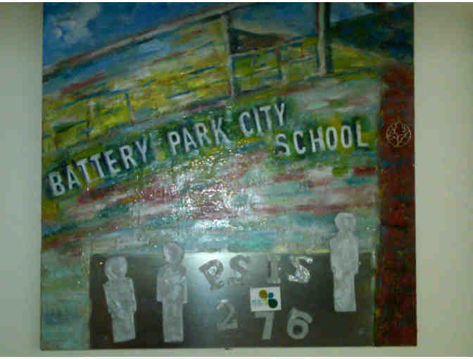 You won't believe it when you see this original oil painting made especially for the auction, of the facade of PS276, with silver and greens as predominant colors. A metallic plate integrated into the painting holds magnetic sculpted shapes of children, who will be customized by paint and photo collage to the family who wins this piece, making a kinetic piece of art that the entire family may enjoy! Oil on wood, 28" x 28". Please visit www.joandilieto.com for more information on the artist.