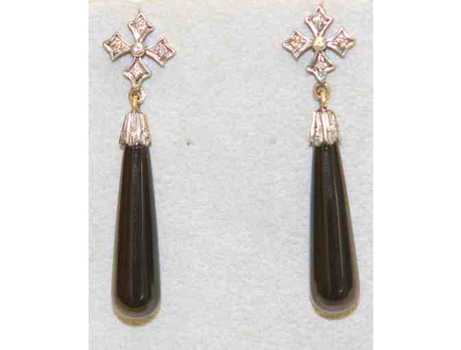 This pair of stunning Victorian Black Onyx Pendant Earrings are set in 18K yellow gold with 16 small diamonds=.25 ct tw circle 1890 (post backs for pierced ears). Length: 44 mm (approximately 1¾ inches).
