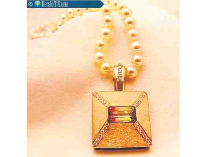 The metal is 14k rose gold with a beautiful brushed finish.  A handmade enhancer with bead set diamonds beautifully compliments the pendant to accommodate an 18" strand of freshwater pearls measuring between 5.5-6mm each.  The freshwater pearls are a high quality rose tone to complete the look.