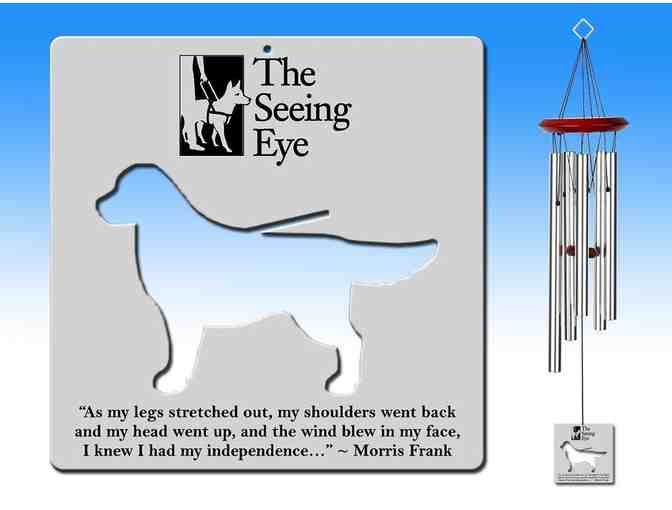 Enjoy that spirit of independence each time even a zephyr blows magical sounds through these silvery wind chimes. Tuned to the five notes of the pentatonic scale, above middle c (g, b-flat, c, d, f) these 23 inch-long chimes sound an endless variety of delicate, ethereal melodies. The striker has a cut-out shape of a golden retriever and the quote above from Morris Frank written in print below the dog cut-out. This chime is a harmonious way to mark your entryway, deck, garden, or a rural mailbox at the end of a driveway.