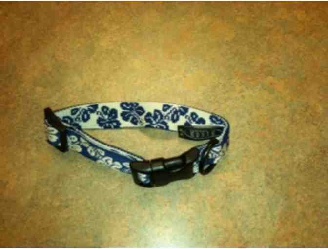 Reflect your dog's unique style and personality with the fun design of this soft, fray-resistant nylon collar. The adjustable one-inch wide collar features built in slides and contoured side squeeze buckles for a quick fit. Medium collar measures 10" - 16." Collar is blue with a white Hawaiian-style flower pattern. Made in the USA.