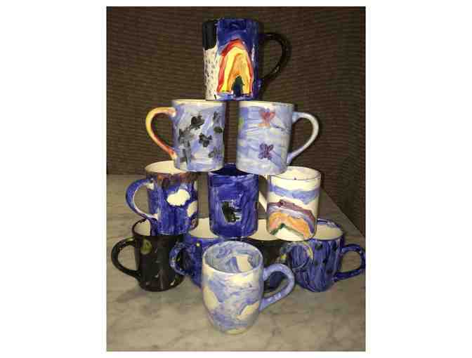One-of-a-kind set of coffee mugs handpainted by Ms. Grant's 4th graders. The kids were inspired by the sky and everything in it when designing the mugs. Expertly painted butterflies, clouds, stars and rainbows abound. Mugs are 4.5 inches high. Dishwasher and microwave safe