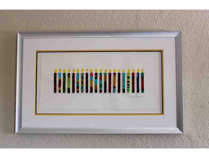 Representing a theme of "Sticking Together" the Kindergarten students of Ms. Erin Cody's class present to you a one of a kind mixed media collaborative masterpiece. Painting sticks with artist quality acrylic paints, the children decorated and designed their sticks with artistic freedom. Once complete the children pressed thumbprints above each of their painted sticks to give the appearance of a head on top of their stick bodies. Professional pen and ink drawings for faces, arms and legs complete the figures. Professional matting in school colors, including a white linen frontal matte and classic brushed silver framing compliment the piece in its entirety.