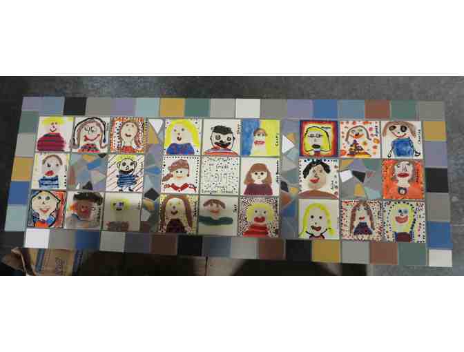 A colorful mosaic tile patio/garden bench made of individual self portraits painted by each student