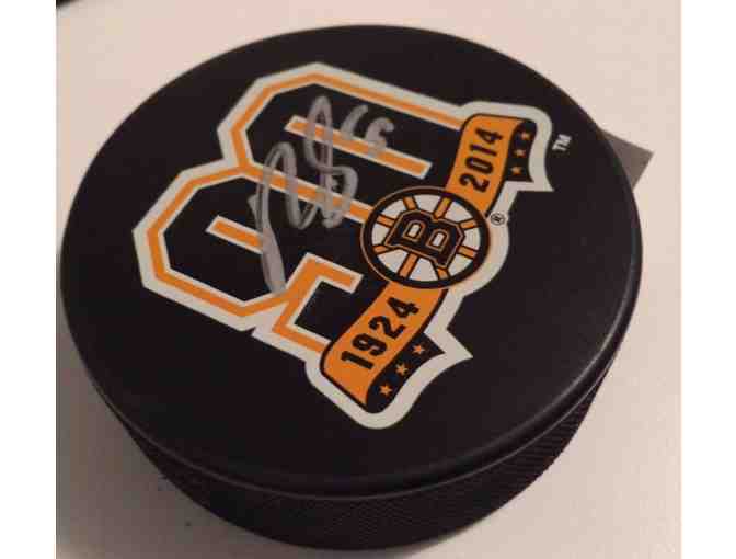Autographed NHL puck by Boston Bruin Center Ryan Spooner.