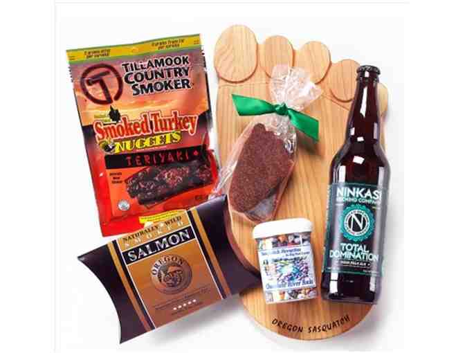 Sasquatch: The Legend has collected together his personal selection of favorite Oregon foods, in the the Sasquatch Favorites Gift Basket 2014. Includind: treats from the forests, farms and waters of Oregon, such as craft beer, turkey jerky, Pacific salmon fillet, Bigfoot cookies, and Sasquatch River Rocks. Great gift for Bigfoot watchers!