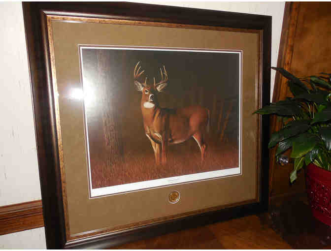 A stunning print of acrylic painting by artist Clarence Stewart of Brewton, Alabama. This framed print measures 35” x 33”, and print measures 23” x 18”. Double matted and framed in a rich wood frame, this print features an Alabama Wildlife Federation Coin. Includes program from Annual Alabama Flora and Fauna Art Show in 2006, when the original won an Award of Merit.