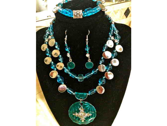 A custom designed multi-layered necklace set which includes a matching bracelet and earrings. Teal enamel focal point pendant, held in place by a teal enamel bail, and embellished with aqua glass beads and silver-tone coin beads.