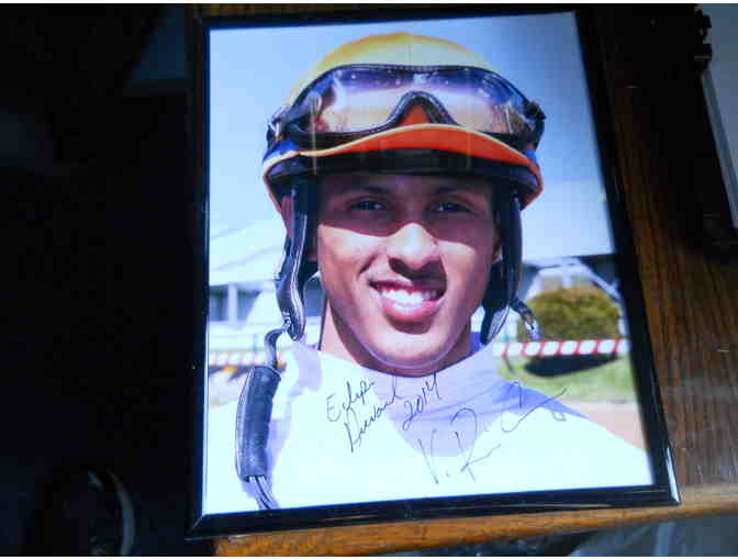 8 by 10 inch framed autographed photo of Eclipse Award apprentice jockey Victor Carrasco, signed March 2014 at Laurel Park, Maryland