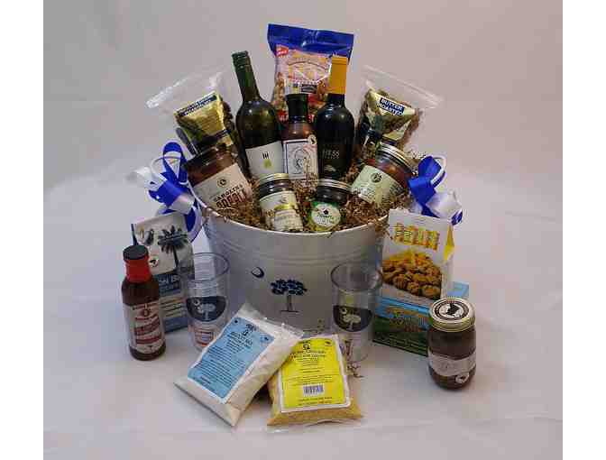 This is a wonderful basket from Uptown Gifts full of great items including: beverage tub with palmetto, Columbia-made adluh grits & biscuit mix, slatterin sauce, butter roasted pecans, chocolate covered pecans, Carolina Creole sauce, American classic tea, iron brew coffee – a Carolina classic, five pepper salsa, black bean dip, Buffa's cheese biscuits, State Street caramel corn, Mother Shucker's cocktail sauce, Sallie's greatest blackberry spice sage jam, pecan pepper jelly, Hess