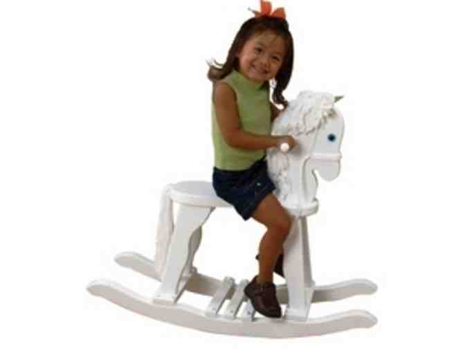 Made of wood, wool mane and tail. Anti-tip rockers.