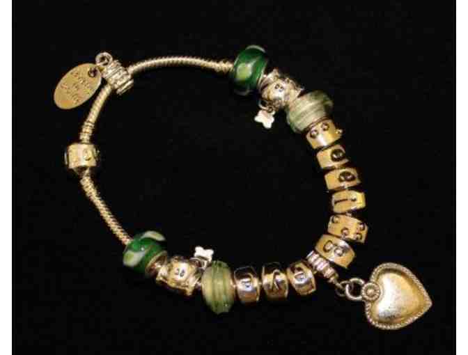 This stylish charm bracelet features green glass beads, a silver heart dangle, a silver-toned puppy head with Milk-Bone, and letter charms that spell out “Seeing Eye” in both print and Braille. The charms slide around a slim, flexible, silver band. Created in silver-toned jeweler's metal, this simple bracelet will make an amazing addition to your collection or a great gift for anyone who is connected to The Seeing Eye. Made specifically for this auction by Kelly M. Fehr, this truly unique item cannot be found elsewhere.