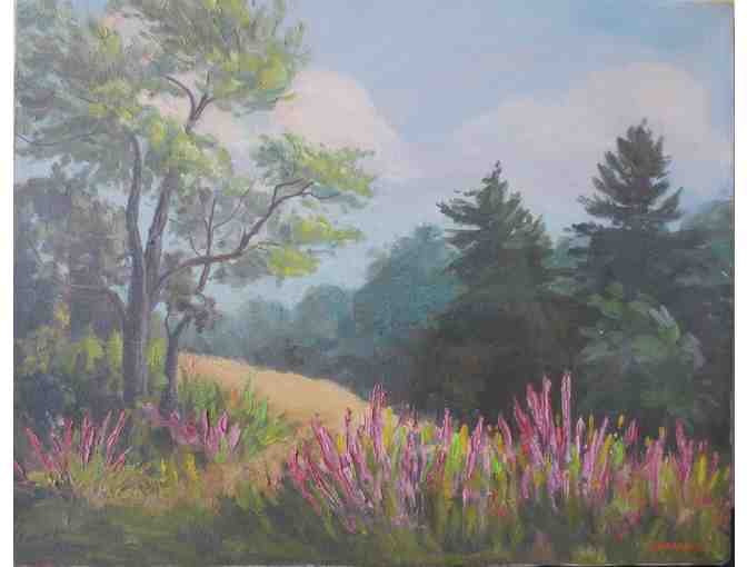 The Purple Loosestrife so often mentioned in Thoreau’s journals, painted by the midcentury artist George Haraden, who lived nearby. 16 x 20 oil on canvas, unframed. The scene, which is typical of Concord, is of a summer meadow shaded by a stand of Hemlock, with the loosestrife rampant in the lowland.