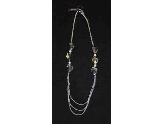 This lovely gunmetal stone and rhinestone statement necklace hangs about 34 inches in total length. A medium-width silver chain clasps at the top with a lobster claw closure. Each side is then broken up by three large transparent gunmetal stones, separated by a total of four round rhinestone spacers. Three thinner chains in silver twist across the bottom of the necklace. The sparkly silver hues will dress up a sweater or blouse that needs a little extra zing.