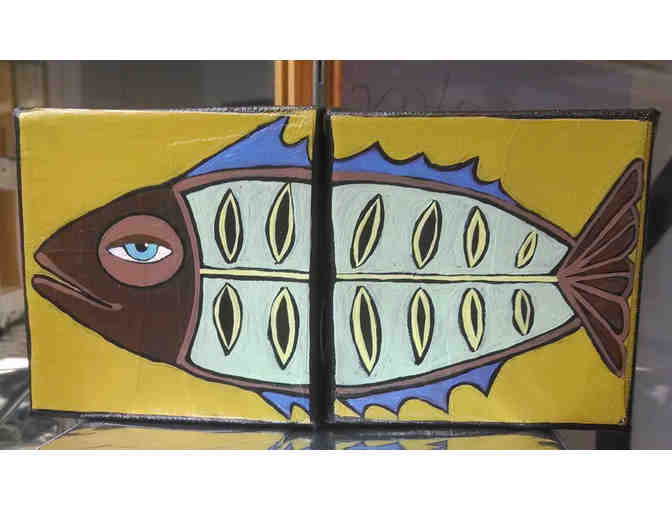 - Two 4" x 4" small square mixed media paintings handpainted with acrylics featuring a fish in two segments.