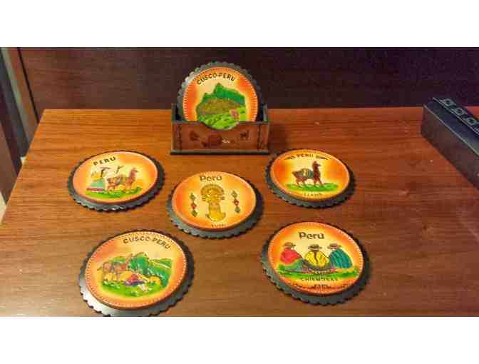Set of six different colorful native scenes, in color. The set comes with a decorative wooden stand.