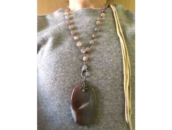 The Aspen based fine jewelry line, The Woods Fine Jewelry, has donated a stunning long beaded Peach Moonstone with diamond clasp and bee agate necklace. This beautiful necklace can turn a t-shirt and jeans into a glamorous outfit and will be the perfect gift for a special occasion.