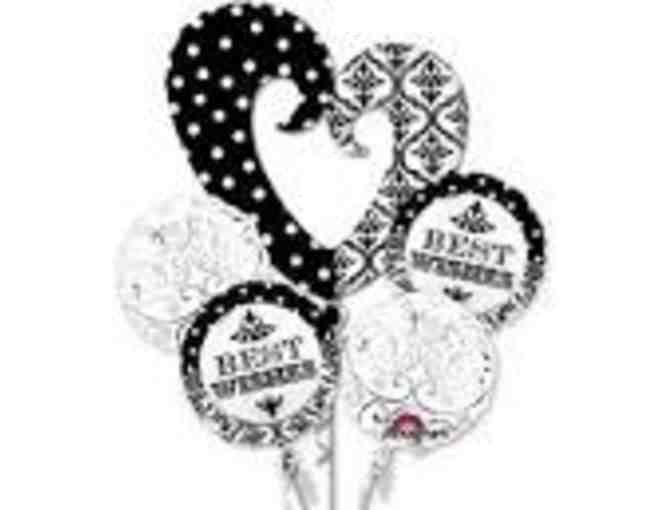 Includes 5 Balloons- 1 Jumbo size, 2 coordinating 18", 2 solid, 5 Ribbons