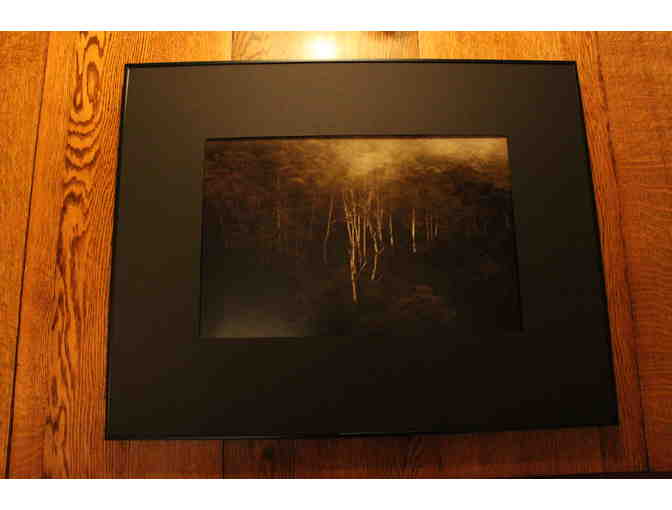Framed photograph. 18x22 inches, including the frame. The frame is black metal and the mat is black, about 4 inches in width. The picture itself is a wooded scene with a stand of birches in the foreground that he digitally highlighted.