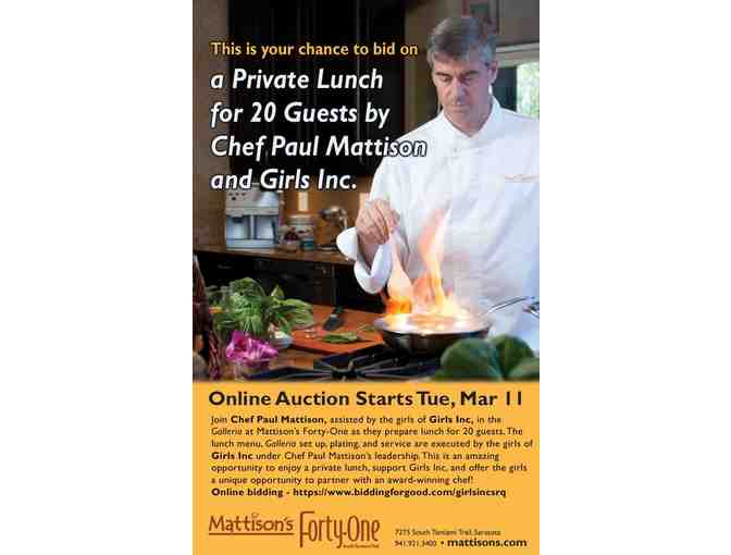 Join Chef Paul Mattison, assisted by the girls of Girls Inc. in the Galleria at Mattison's Forty-One as they prepare lunch for 20 guests. The lunch menu, Galleria set up, plating and service are executed by the girls of Girls Inc. under Chef Paul Mattison's leadership. This is an amazing opportunity to enjoy a private lunch, support Girls Inc. and offer the girls a unique opportunity to partner with an award-winning chef!