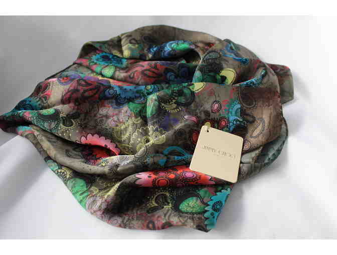 Add a touch of spring to any outfit with a dark floral Jimmy Choo “Searle” scarf made from light-silk satin. This beautiful accessory combines a modern floral print with vibrant watercolor detailing on an olive background. This simple accessory is a staple to any wardrobe.