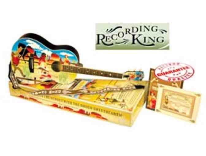 This beautiful Rodeo Sweethearts Acoustic Guitar from Recording King is the first of the Western Collectible Guitar Series. It is a concert size acoustic guitar which incorporates cowboy-themed art throughout the guitar. The Rodeo Sweethearts guitar is a great guitar for beginners and collectors alike.