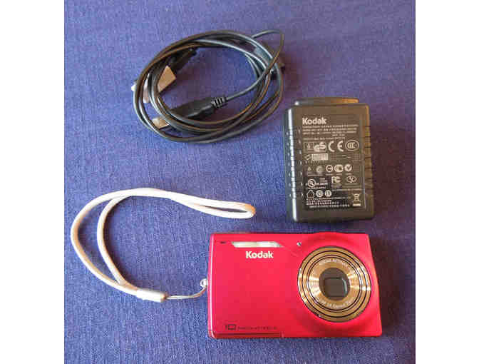 Like-new Kodak digital camera with adapter for computer and electrical outlet charge. A lovely little item that you can toss into your pocket to capture memories! 4 GB card. Bright red.