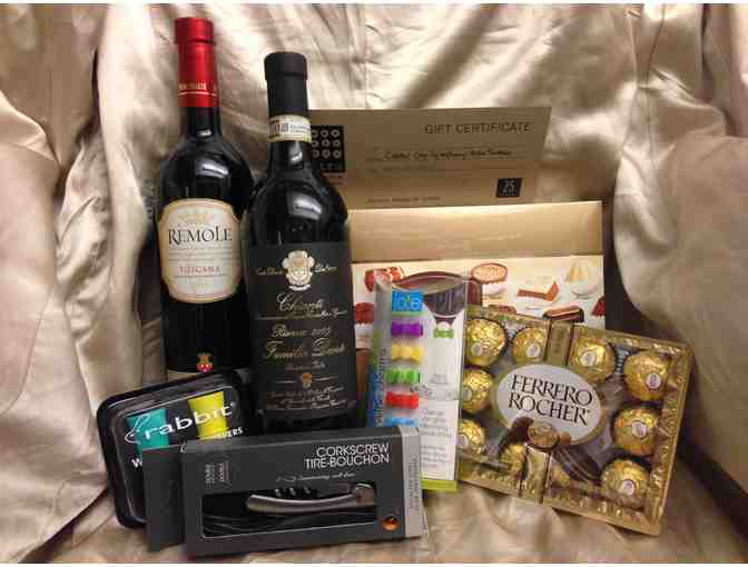 Two bottles of wine with wine bottle dressings; two boxes of chocolates; and $25 gift certificate to Astro Doughnuts & Fried Chicken