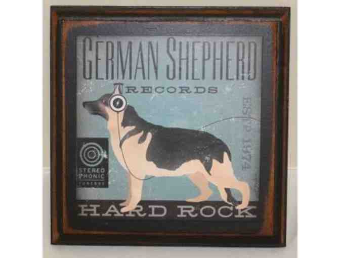 This brown-on-brown square wood plaque is embellished with a retro-style illustration of a suave tan and black German Shepherd listening to records in a cool room. He sits on a teal blue background, and the plaque is adorned with black and white text. This is a fun gift item that can also pair nicely with the German Shepherd Brew House Plaque (item #296).