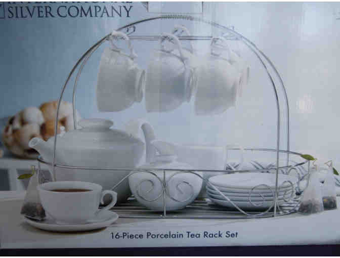 All you need for a tea party for SIX but the tea bags and the scones!!! Here's a 24 ounce tea pot, 6 cups and saucers, sugar bow, creamer and a metal rack, ready to go! (Pssst! That wedding gift? Here it is!!!)