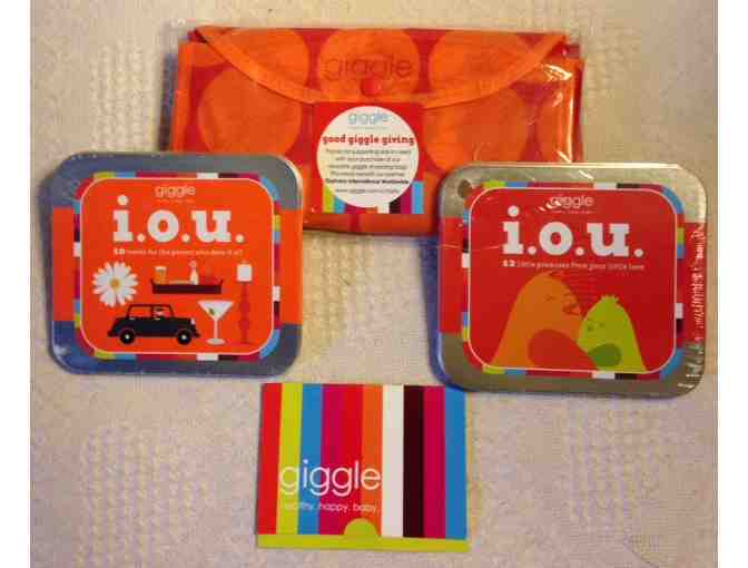 This delightful set includes a $50 gift certificate, I.O.U. card sets - one from parent, one from child - packaged in sturdy tin boxes, and a reusable Giggle shopping bag.