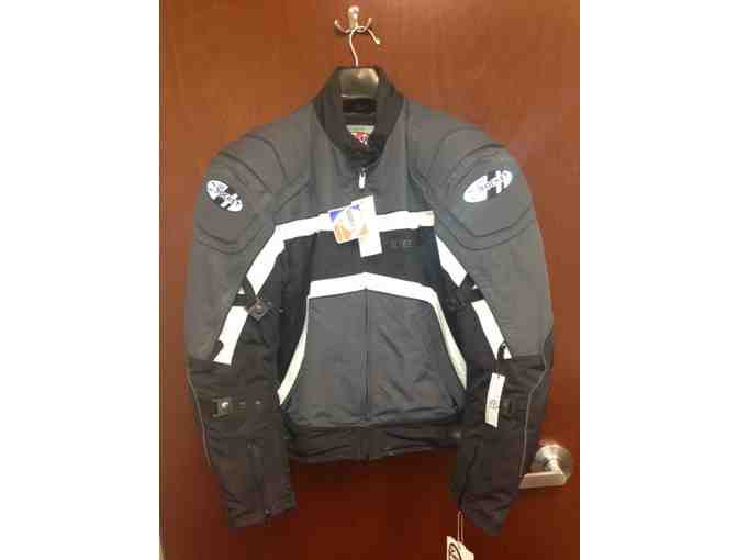 This gray, black, and white short waist, sport-style jacket is great for street riders in all parts of the country due to its comfort, features (100% waterproof, variable flow ventilation system, removable insulated full sleeve liner, sure fit adjustable waistband to name a few) and its climate control design. It is a mens size large