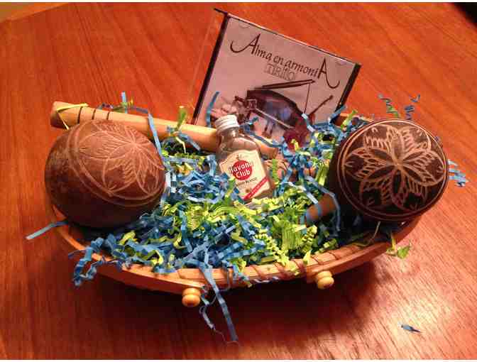 This collection of authentic maracas, percussion sticks, a CD and a shot of Cuban rum was donated by a friend just back from a trip to Cuba.