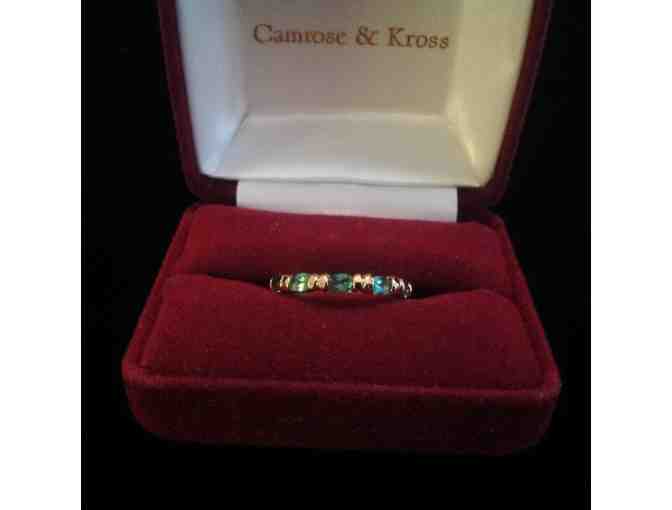 Vermeil and 24 karat gold plated eternity ring crafted by Camrose & Kross as a rendering of the ring given to Jacqueline Bouvier Kennedy by her husband President John F. Kennedy on their 10th anniversary in 1963. It has 10 emerald CZ stones. Size 8.