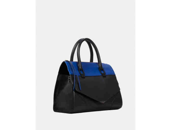 Join the ranks of the young and the glamorous with this sleek Pour La Victoire Prouve Satchel.  Touted and toted by the likes of Elizabeth Olsen, Dakota Fanning, and Blake Lively, Pour La Victoire is luxury for the bohemian at heart.  Furnished with an optional cross-body strap, this genuine black leather bag with royal blue topline embodies at once classic style and rebel flare.  So indulge your inner fashionista and give the Sartorialist a reason to snap your pic…