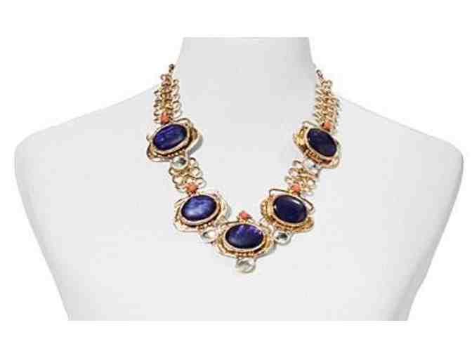 You'll feel special wearing this bold, bright and beautiful necklace. It presents a stunning splash with oval carbochons in sapphire blue highlighted by hints of coral and sparkly faceted beads. Golden frame adds an elegant touch. Length: 20-3/4 in. plus 3 in. extender; lobster clasp; mixed metal, resin.