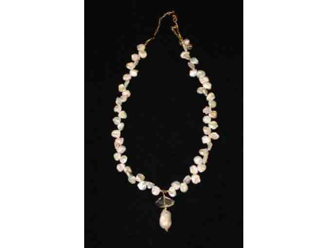 A one-of-a-kind pearl necklace, 18 inches with a drop crystal and Biwa pearl dangle, this unusual necklace of Keshi pearls could enhance any elegant outfit, even a wedding gown. Handcrafted by Ruth Tatz, it hangs from a graceful, gold, lobster claw latching closure. In gold, crystal and white, it will enhance your ensemble for any special occasion.