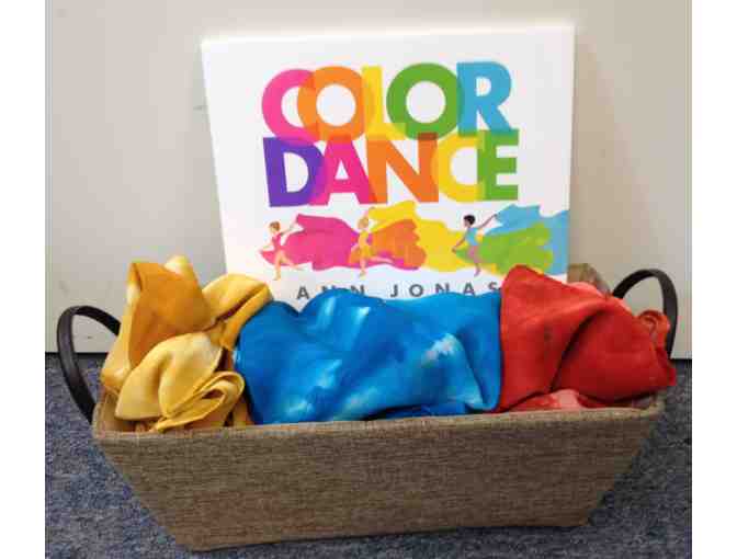 Three silk scarves to accompany the book Color Dance by Ann Jonas. Scarves are hand-dyed.