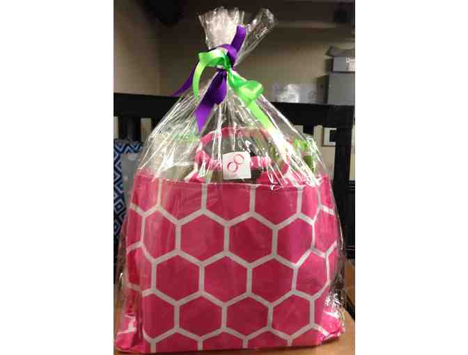 This beautiful hot pink and white honeycomb pattern canvas bag is packed with goodies from Swoozies in Cherry Creek North. There are staduim cups, beverage napkins, a pencil pouch, yummy cookies, a book and a happy sign.