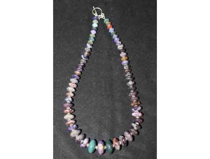 Every jewelry box needs a piece with a rock-solid natural look that goes with everything! This lovely agate necklace features earth-toned stones in purple, green, brown, and grey, separated by tiny pewter spacers and fastened with a silver loop and bar closure. Handmade by Cynthia Kirby, it falls 18” around the neck, and would look spectacular with almost any sweater, shirt, or dress.