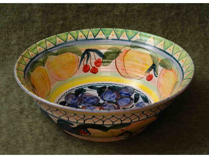 A handmade, large (12"'x12"'x4") terracotta bowl with majolica glaze, fired to cone 05. Wheel thrown and decorated by hand. Food safe.