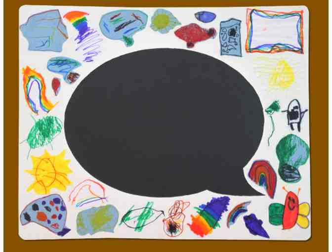 This collaborative chalkboard project began with an art lesson that taught the children that shapes are all around us and if they observe and examine things carefully, they will find lots of shapes. The children learned that they can use these found shapes to help them draw and create everything, even items they see in the sky. Each child chose what they wanted to draw for the chalkboard and placed it on the chalkboard. This project helped the children develop self-confidence in their drawing abilities, and also encouraged teamwork with its collaborative nature.